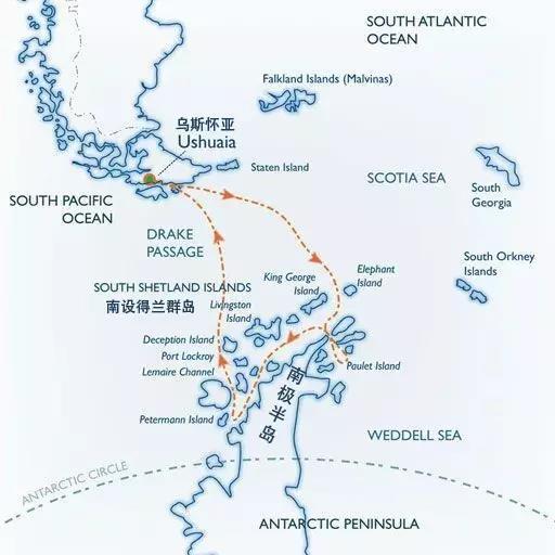▲3.穿越南极圈航线:含南极半岛及南设得兰群岛,并穿越南极圈